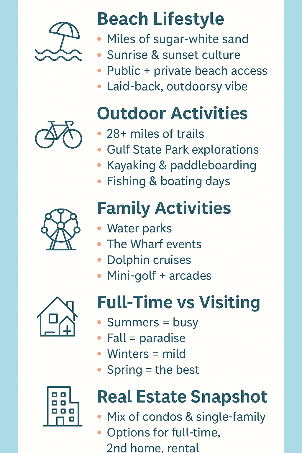 - 🏡 Real Estate: Mix of full-time neighborhoods, second homes, and condos—from budget-friendly to luxury Gulf-front.